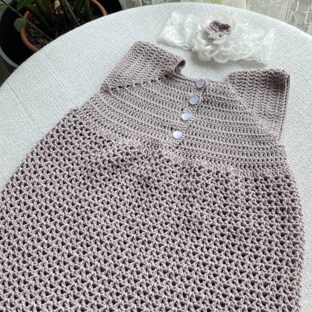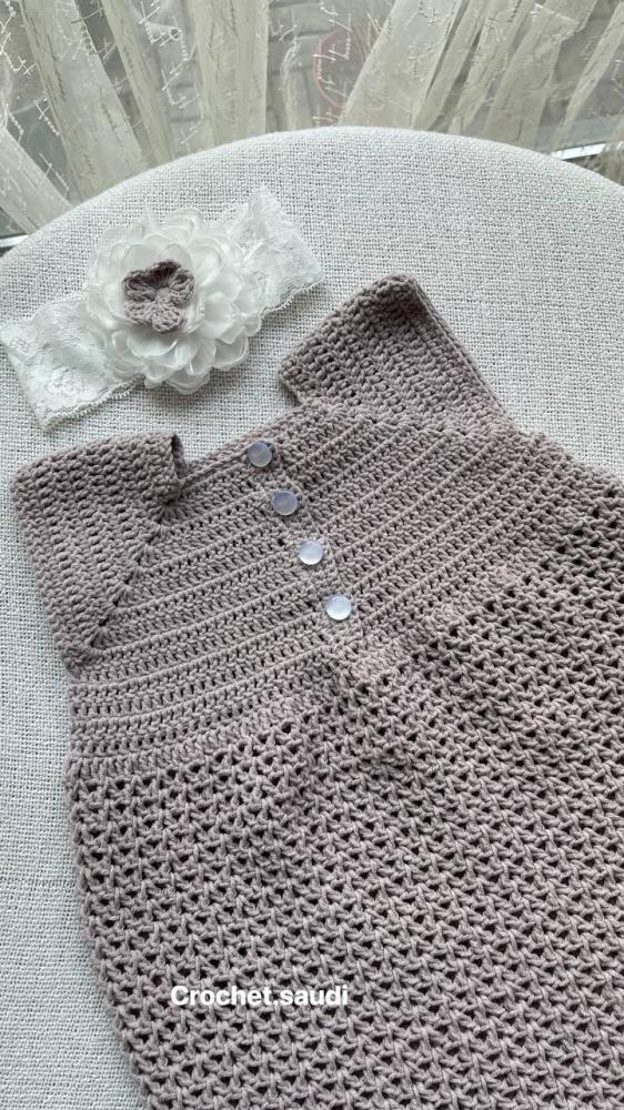 فستان كروشيه أنيق للأطفال مصنوع يدويًا بدقة عالية ليمنح طفلتك لمسة من الرقي والنعومة. يتميز بتصميمه الكلاسيكي بالأزرار الأمامية ونقشة مفرغة جذابة، مع طوق رأس من الدانتيل مزين بوردة أنيقة ليكمل الإطلالة بسحر فريد. مثالي للمناسبات الخاصة أو للعيد
